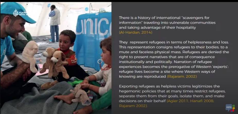 Yafa El Masri travaille avec Al Jazeera Media Institute sur les récits et représentations médiatiques des personnes réfugiées. Son double statut de chercheuse et de personne concernée lui permet de poser un regard critique sur ce type "d'image Unicef" comme elle les appelle. Ces photos, prises par des ONG ou des reporters, représentent toujours, selon elle, les personnes réfugiées lorsqu'elles sont les plus faibles, affamées, sales, misérables et surtout dépendantes d'une entité étrangère. Ces photos transmises par les médias internationaux deviennent la seule représentation qui nous parvient, éclipsant ainsi toute la diversité et la richesse de ces groupes. Pour Yafa El Masri, ces photos deviennent des prisons qui façonnent tous les rapports que nous entretenons avec ces populations, et ce toujours dans un même sens et depuis de nombreuses années. Elle souligne que ces représentations servaient déjà de socle aux argumentaires coloniaux et esclavagistes du XVème au XXème siècle. Selon la chercheuse, y a un lien fort entre la manière de représenter ces personnes et la manière dont nous justifions la violence envers elles.